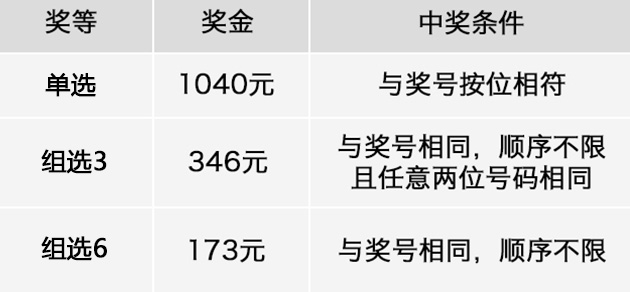 單選:投注號碼與當(dāng)期開獎號碼按位全部相同(百位+十位+個位),即中獎。