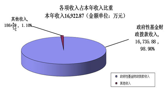 本部門2017年度收入合計16,922.87 萬元。其中:財政撥款收入16,735.88 萬元,占總收入的98.90%;上級補助收入0萬元,占總收入的0%;事業(yè)收入0萬元,占總收入的0%;經(jīng)營收入0萬元,占總收入的0%;附屬單位繳款收入0萬元,占總收入的0%;其他收入186.99 萬元,占總收入的1.1%。