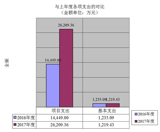與上年對比,本年收入比上年減少758.46萬元,比上年減少4.29%;其中:政府性基金財政撥款收入16,735.88萬元,比上年減少3.87%,其他收入186.99萬元,比上年減少31.11%。與上年相比收入減少的主要原因是:2016年收到政府性基金財政撥款收入—彩票市場調控資金1,244.45萬元,相比較而言,2017年先收到中央彩票市場調控資金141萬元,后該資金又被省財政廳收回。其他收入減少則是因為2017年度收到的稅務機關返還手續(xù)費較2016年度減少,單位銀行利息收入、國有資產(chǎn)處置收入、國有資產(chǎn)出租收入等非稅收入均上繳省非稅局,不作為其他收入核算。